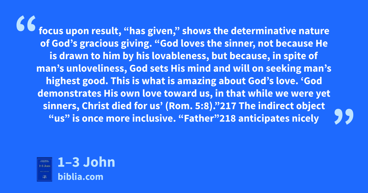 focus upon result, “has given,” shows the determinative nature of God’s gracious giving. “God loves the sinner, not because He is drawn to him by his lovableness, but because, in spite of man’s unloveliness, God sets His mind and will on seeking man’s highest good. This is what is amazing about God’s love. ‘God demonstrates His own love toward us, in that while we were yet sinners, Christ died for us’ (Rom. 5:8).”217 The indirect object “us” is once more inclusive. “Father”218 anticipates nicely