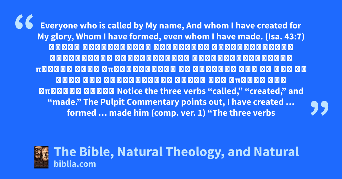 Everyone who is called by My name, And whom I have created for My glory, Whom I have formed, even whom I have made. (Isa. 43:7) כֹּ֚ל הַנִּקְרָ֣א בִשְׁמִ֔י וְלִכְבוֹדִ֖י בּרָאתִ֑יו יְצַרְתִּ֖יו אַף־עֲשִׂיתִֽיו׃ πάντας ὅσοι ἐπικέκληνται τῷ ὀνόματί μου ἐν γὰρ τῇ δόξῃ μου κατεσκεύασα αὐτὸν καὶ ἔπλασα καὶ ἐποίησα αὐτόν Notice the three verbs “called,” “created,” and “made.” The Pulpit Commentary points out, I have created … formed … made him (comp. ver. 1) “The three verbs