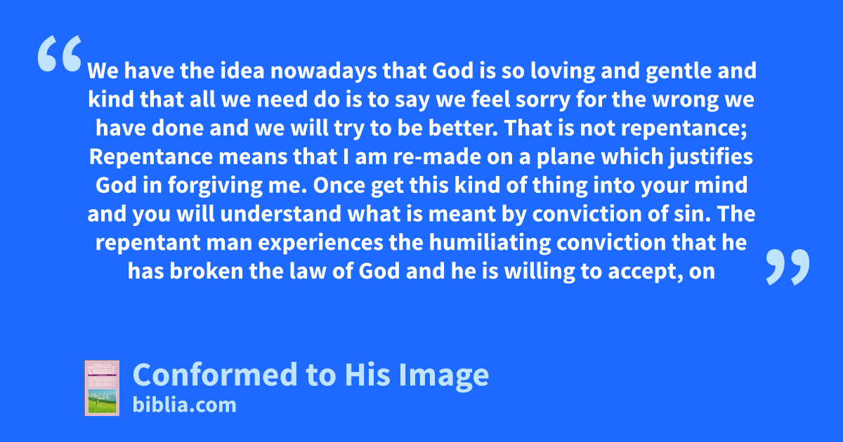 We have the idea nowadays that God is so loving and gentle and kind that all we need do is to say we feel sorry for the wrong we have done and we will try to be better. That is not repentance; Repentance means that I am re-made on a plane which justifies God in forgiving me. Once get this kind of thing into your mind and you will understand what is meant by conviction of sin. The repentant man experiences the humiliating conviction that he has broken the law of God and he is willing to accept, on