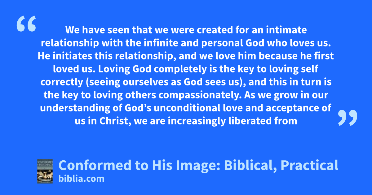 We have seen that we were created for an intimate relationship with the infinite and personal God who loves us. He initiates this relationship, and we love him because he first loved us. Loving God completely is the key to loving self correctly (seeing ourselves as God sees us), and this in turn is the key to loving others compassionately. As we grow in our understanding of God’s unconditional love and acceptance of us in Christ, we are increasingly liberated from