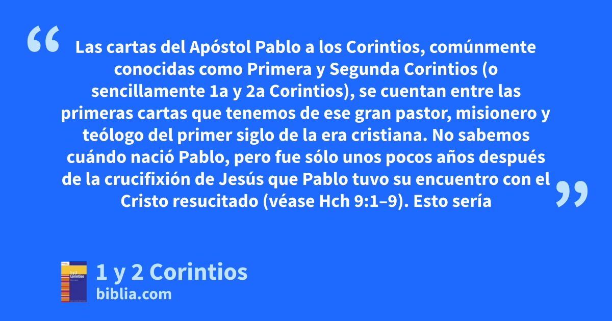 Las cartas del Apóstol Pablo a los Corintios, comúnmente conocidas como Primera y Segunda Corintios (o sencillamente 1a y 2a Corintios), se cuentan entre las primeras cartas que tenemos de ese gran pastor, misionero y teólogo del primer siglo de la era cristiana. No sabemos cuándo nació Pablo, pero fue sólo unos pocos años después de la crucifixión de Jesús que Pablo tuvo su encuentro con el Cristo resucitado (véase Hch 9:1–9). Esto sería