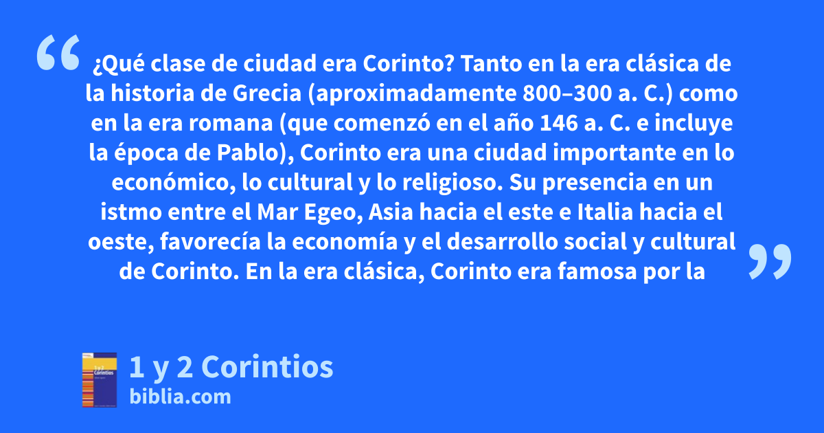 ¿Qué clase de ciudad era Corinto? Tanto en la era clásica de la historia de Grecia (aproximadamente 800–300 a. C.) como en la era romana (que comenzó en el año 146 a. C. e incluye la época de Pablo), Corinto era una ciudad importante en lo económico, lo cultural y lo religioso. Su presencia en un istmo entre el Mar Egeo, Asia hacia el este e Italia hacia el oeste, favorecía la economía y el desarrollo social y cultural de Corinto. En la era clásica, Corinto era famosa por la