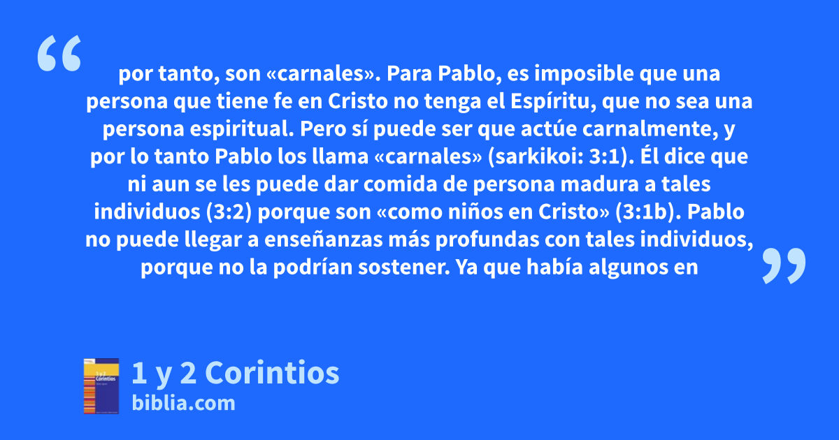 por tanto, son «carnales». Para Pablo, es imposible que una persona que tiene fe en Cristo no tenga el Espíritu, que no sea una persona espiritual. Pero sí puede ser que actúe carnalmente, y por lo tanto Pablo los llama «carnales» (sarkikoi: 3:1). Él dice que ni aun se les puede dar comida de persona madura a tales individuos (3:2) porque son «como niños en Cristo» (3:1b). Pablo no puede llegar a enseñanzas más profundas con tales individuos, porque no la podrían sostener. Ya que había algunos en