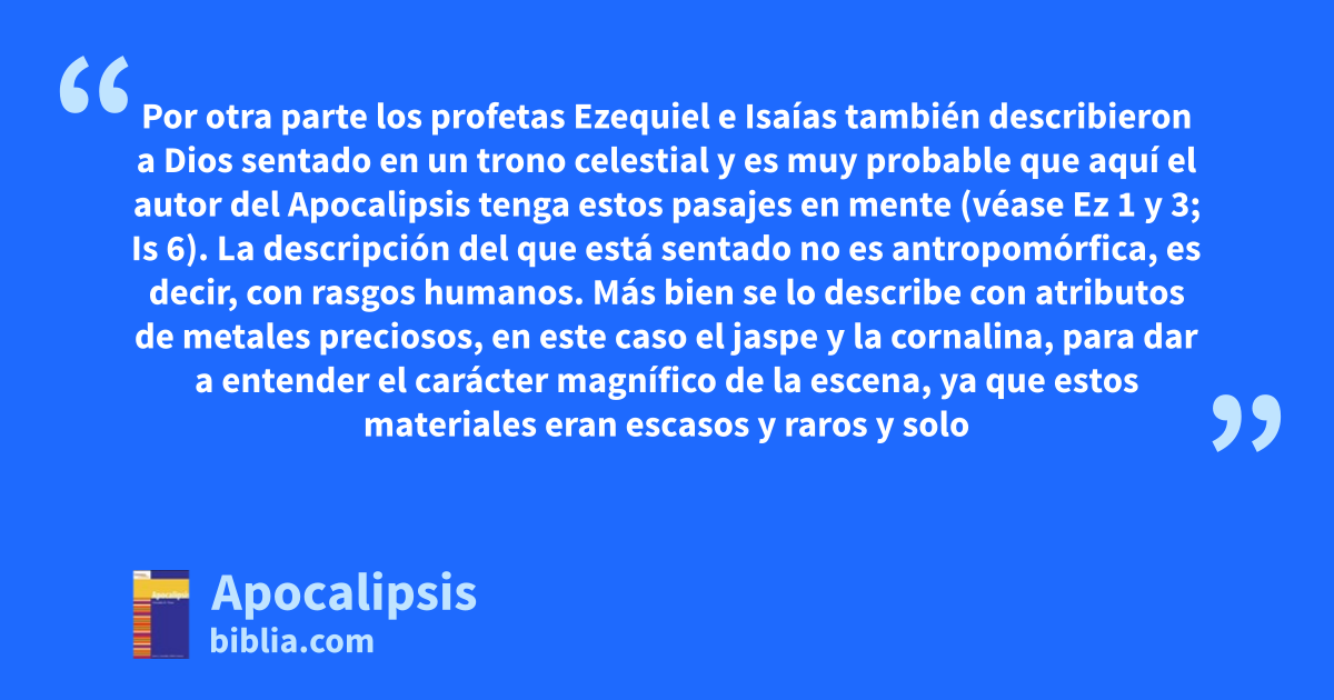 Por otra parte los profetas Ezequiel e Isaías también describieron a Dios sentado en un trono celestial y es muy probable que aquí el autor del Apocalipsis tenga estos pasajes en mente (véase Ez 1 y 3; Is 6). La descripción del que está sentado no es antropomórfica, es decir, con rasgos humanos. Más bien se lo describe con atributos de metales preciosos, en este caso el jaspe y la cornalina, para dar a entender el carácter magnífico de la escena, ya que estos materiales eran escasos y raros y solo