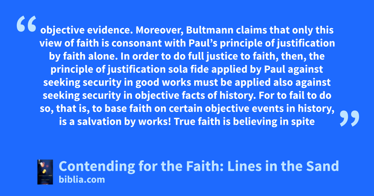 objective evidence. Moreover, Bultmann claims that only this view of faith is consonant with Paul’s principle of justification by faith alone. In order to do full justice to faith, then, the principle of justification sola fide applied by Paul against seeking security in good works must be applied also against seeking security in objective facts of history. For to fail to do so, that is, to base faith on certain objective events in history, is a salvation by works! True faith is believing in spite