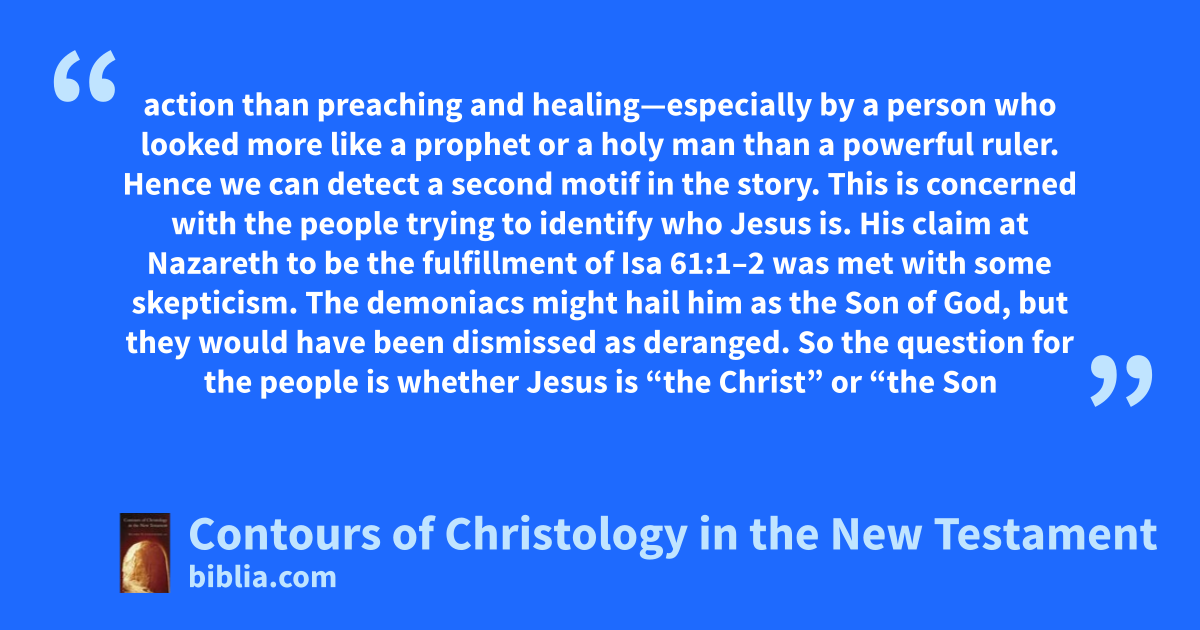 action than preaching and healing—especially by a person who looked more like a prophet or a holy man than a powerful ruler. Hence we can detect a second motif in the story. This is concerned with the people trying to identify who Jesus is. His claim at Nazareth to be the fulfillment of Isa 61:1–2 was met with some skepticism. The demoniacs might hail him as the Son of God, but they would have been dismissed as deranged. So the question for the people is whether Jesus is “the Christ” or “the Son
