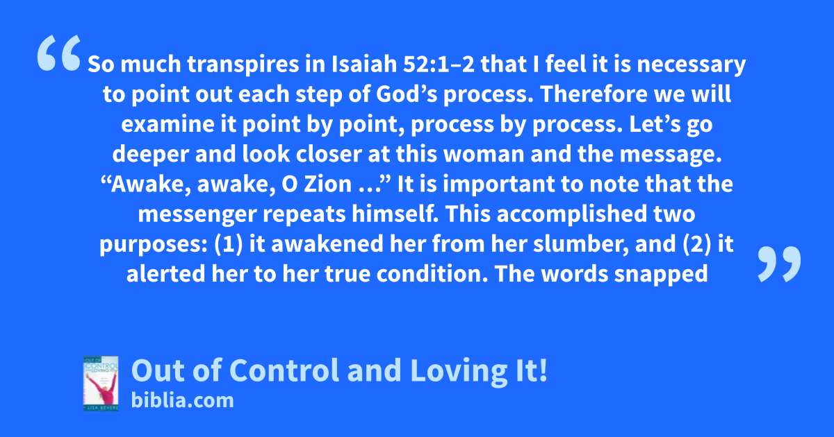 So much transpires in Isaiah 52:1–2 that I feel it is necessary to point out each step of God’s process. Therefore we will examine it point by point, process by process. Let’s go deeper and look closer at this woman and the message. “Awake, awake, O Zion …” It is important to note that the messenger repeats himself. This accomplished two purposes: (1) it awakened her from her slumber, and (2) it alerted her to her true condition. The words snapped