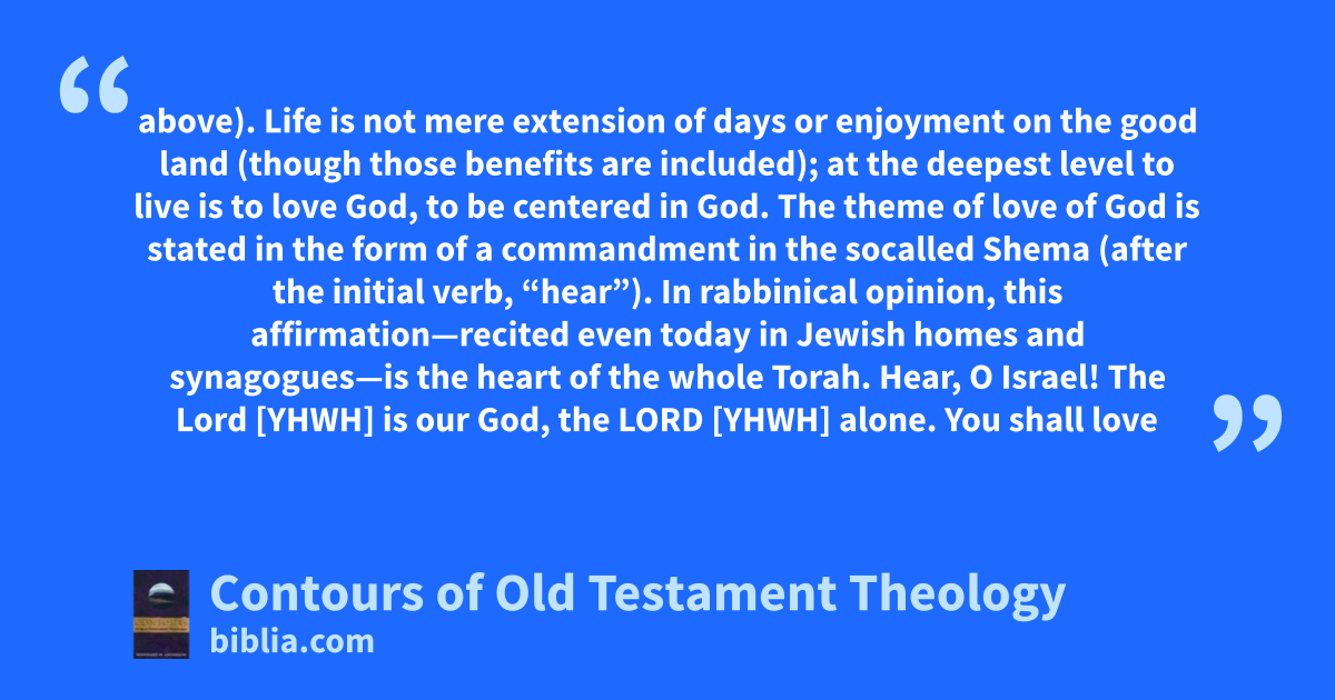 above). Life is not mere extension of days or enjoyment on the good land (though those benefits are included); at the deepest level to live is to love God, to be centered in God. The theme of love of God is stated in the form of a commandment in the socalled Shema (after the initial verb, “hear”). In rabbinical opinion, this affirmation—recited even today in Jewish homes and synagogues—is the heart of the whole Torah. Hear, O Israel! The Lord [YHWH] is our God, the LORD [YHWH] alone. You shall love