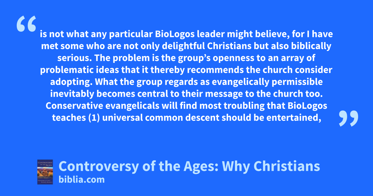is not what any particular BioLogos leader might believe, for I have met some who are not only delightful Christians but also biblically serious. The problem is the group’s openness to an array of problematic ideas that it thereby recommends the church consider adopting. What the group regards as evangelically permissible inevitably becomes central to their message to the church too. Conservative evangelicals will find most troubling that BioLogos teaches (1) universal common descent should be entertained,