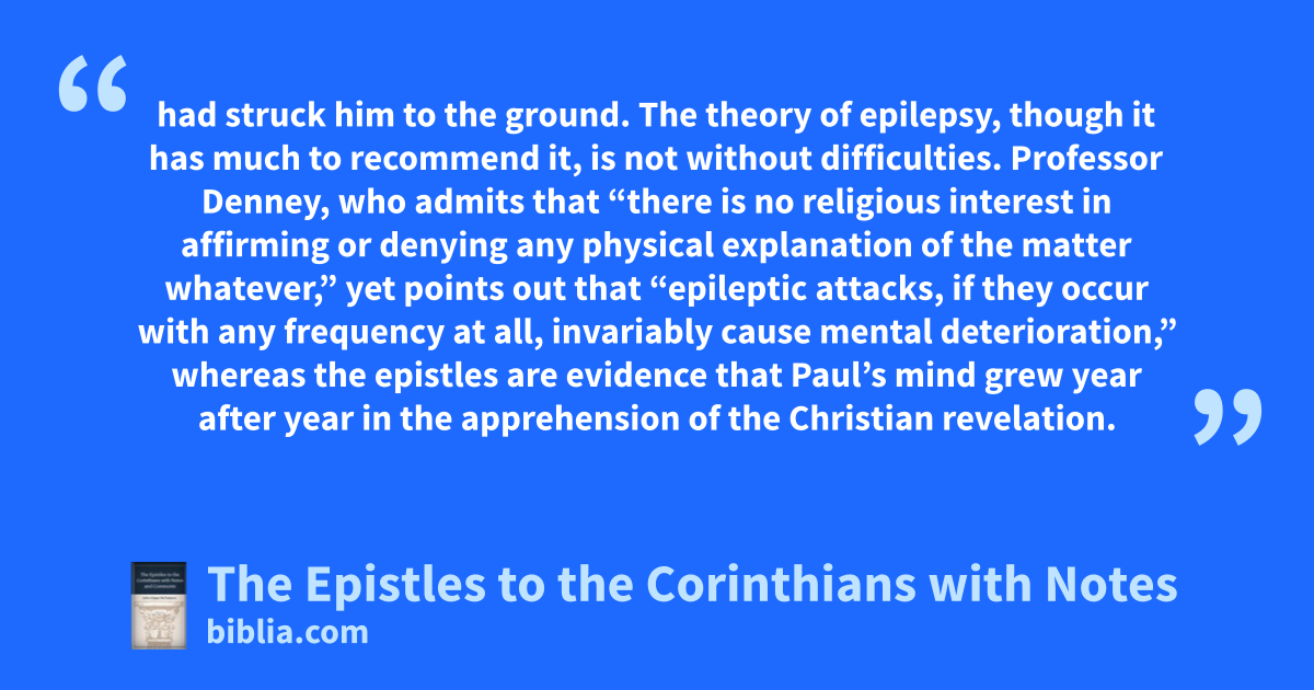 had struck him to the ground. The theory of epilepsy, though it has much to recommend it, is not without difficulties. Professor Denney, who admits that “there is no religious interest in affirming or denying any physical explanation of the matter whatever,” yet points out that “epileptic attacks, if they occur with any frequency at all, invariably cause mental deterioration,” whereas the epistles are evidence that Paul’s mind grew year after year in the apprehension of the Christian revelation.