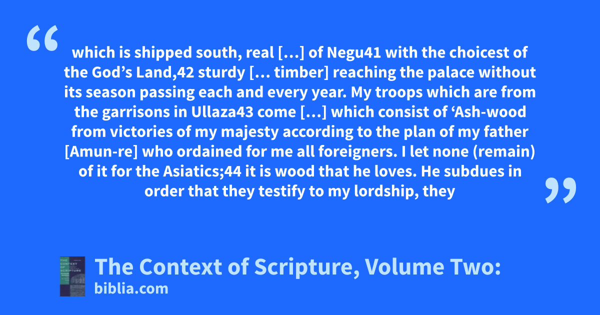 which is shipped south, real […] of Negu41 with the choicest of the God’s Land,42 sturdy [… timber] reaching the palace without its season passing each and every year. My troops which are from the garrisons in Ullaza43 come […] which consist of ‘Ash-wood from victories of my majesty according to the plan of my father [Amun-re] who ordained for me all foreigners. I let none (remain) of it for the Asiatics;44 it is wood that he loves. He subdues in order that they testify to my lordship, they