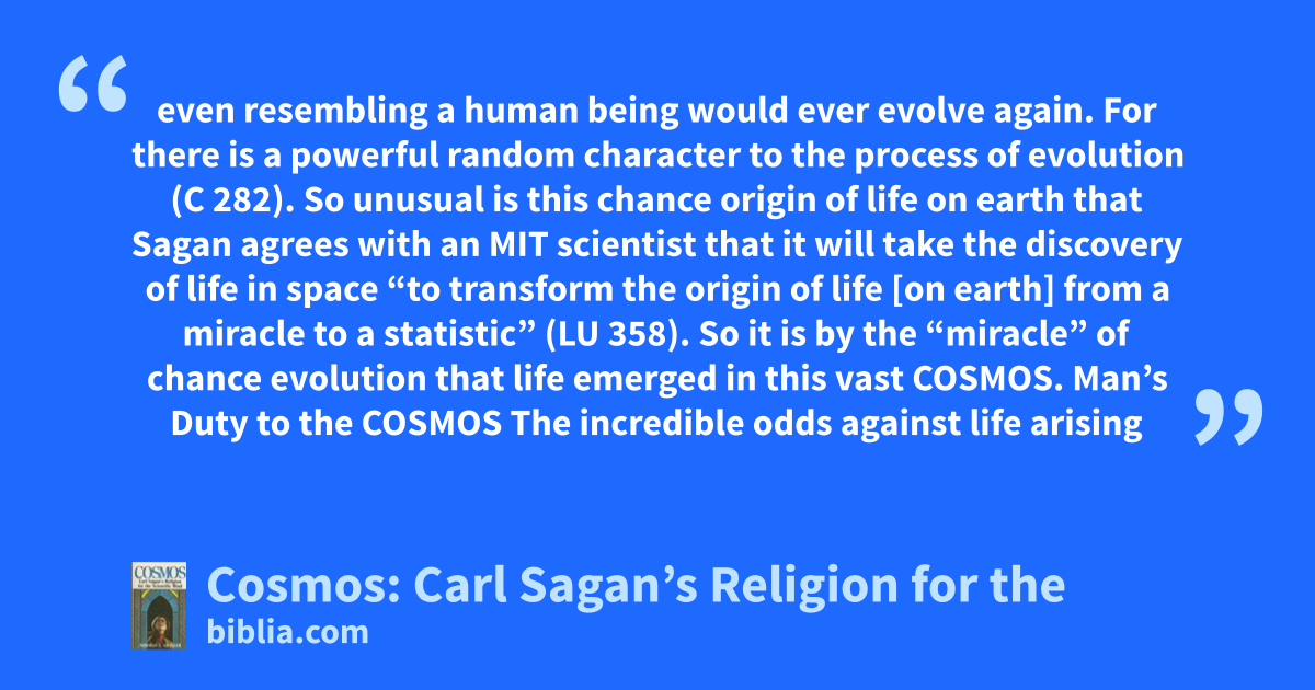 even resembling a human being would ever evolve again. For there is a powerful random character to the process of evolution (C 282). So unusual is this chance origin of life on earth that Sagan agrees with an MIT scientist that it will take the discovery of life in space “to transform the origin of life [on earth] from a miracle to a statistic” (LU 358). So it is by the “miracle” of chance evolution that life emerged in this vast COSMOS. Man’s Duty to the COSMOS The incredible odds against life arising