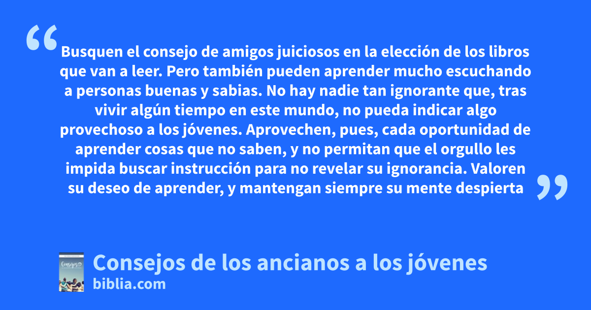 Busquen el consejo de amigos juiciosos en la elección de los libros que van a leer. Pero también pueden aprender mucho escuchando a personas buenas y sabias. No hay nadie tan ignorante que, tras vivir algún tiempo en este mundo, no pueda indicar algo provechoso a los jóvenes. Aprovechen, pues, cada oportunidad de aprender cosas que no saben, y no permitan que el orgullo les impida buscar instrucción para no revelar su ignorancia. Valoren su deseo de aprender, y mantengan siempre su mente despierta