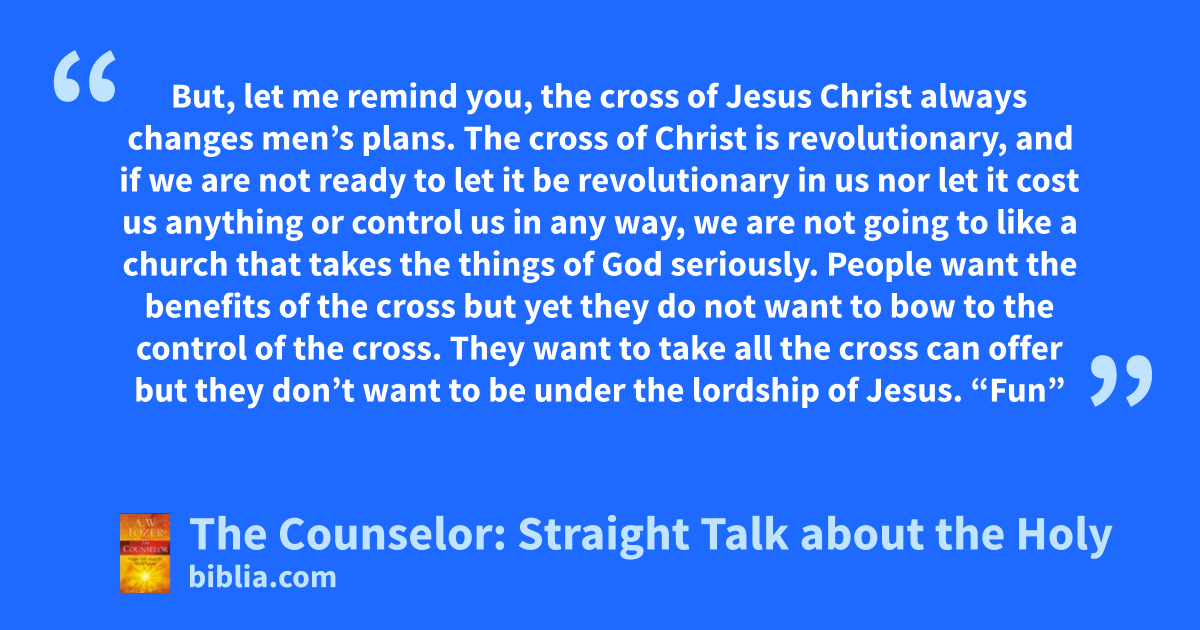 But, let me remind you, the cross of Jesus Christ always changes men’s plans. The cross of Christ is revolutionary, and if we are not ready to let it be revolutionary in us nor let it cost us anything or control us in any way, we are not going to like a church that takes the things of God seriously. People want the benefits of the cross but yet they do not want to bow to the control of the cross. They want to take all the cross can offer but they don’t want to be under the lordship of Jesus. “Fun”