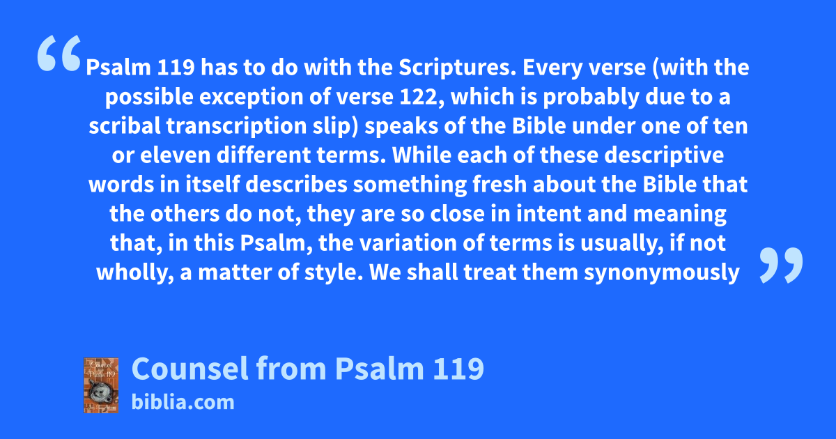 Psalm 119 has to do with the Scriptures. Every verse (with the possible exception of verse 122, which is probably due to a scribal transcription slip) speaks of the Bible under one of ten or eleven different terms. While each of these descriptive words in itself describes something fresh about the Bible that the others do not, they are so close in intent and meaning that, in this Psalm, the variation of terms is usually, if not wholly, a matter of style. We shall treat them synonymously