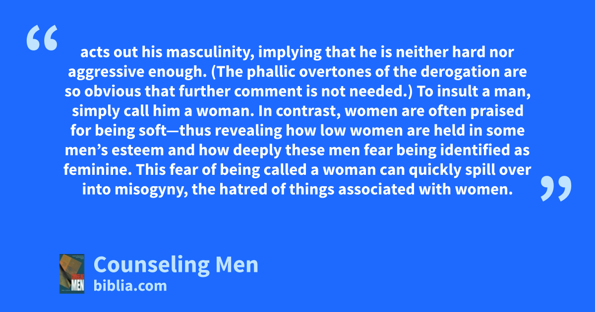 acts out his masculinity, implying that he is neither hard nor aggressive enough. (The phallic overtones of the derogation are so obvious that further comment is not needed.) To insult a man, simply call him a woman. In contrast, women are often praised for being soft—thus revealing how low women are held in some men’s esteem and how deeply these men fear being identified as feminine. This fear of being called a woman can quickly spill over into misogyny, the hatred of things associated with women.