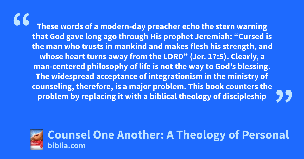 These words of a modern-day preacher echo the stern warning that God gave long ago through His prophet Jeremiah: “Cursed is the man who trusts in mankind and makes flesh his strength, and whose heart turns away from the LORD” (Jer. 17:5). Clearly, a man-centered philosophy of life is not the way to God’s blessing. The widespread acceptance of integrationism in the ministry of counseling, therefore, is a major problem. This book counters the problem by replacing it with a biblical theology of discipleship