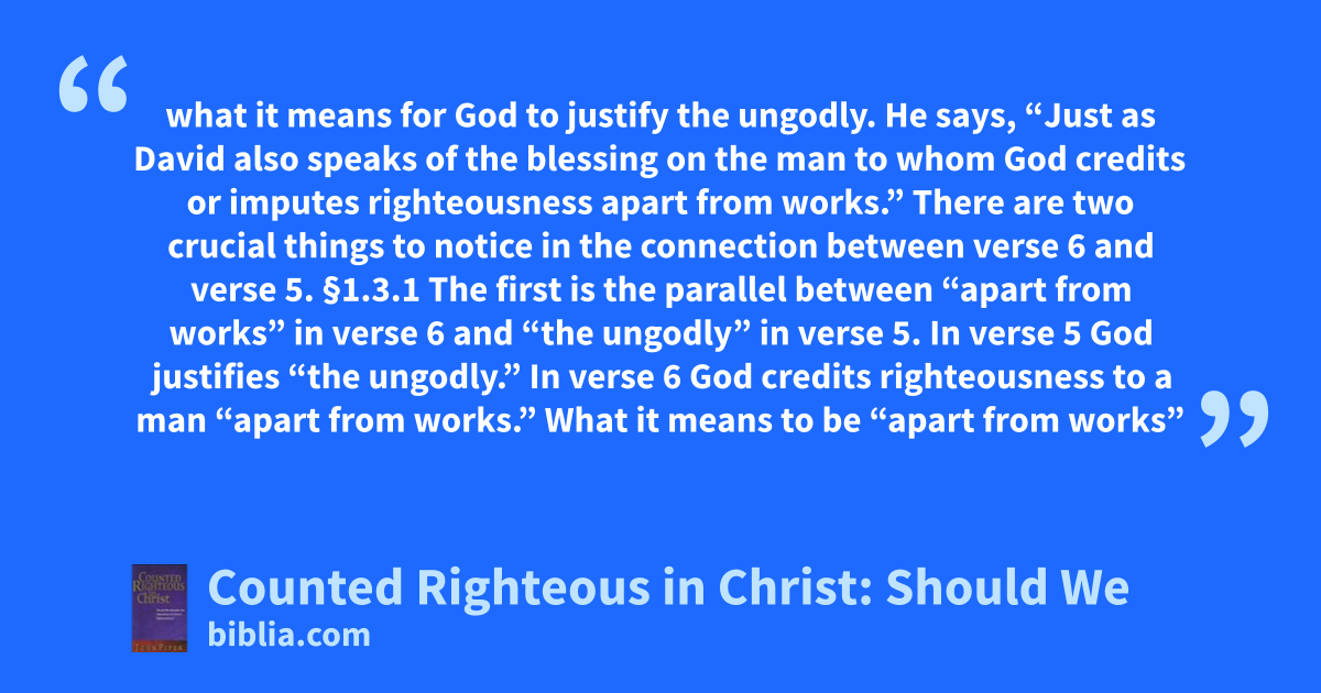 what it means for God to justify the ungodly. He says, “Just as David also speaks of the blessing on the man to whom God credits or imputes righteousness apart from works.” There are two crucial things to notice in the connection between verse 6 and verse 5. §1.3.1 The first is the parallel between “apart from works” in verse 6 and “the ungodly” in verse 5. In verse 5 God justifies “the ungodly.” In verse 6 God credits righteousness to a man “apart from works.” What it means to be “apart from works”