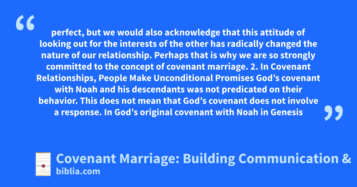 perfect, but we would also acknowledge that this attitude of looking out for the interests of the other has radically changed the nature of our relationship. Perhaps that is why we are so strongly committed to the concept of covenant marriage. 2. In Covenant Relationships, People Make Unconditional Promises God’s covenant with Noah and his descendants was not predicated on their behavior. This does not mean that God’s covenant does not involve a response. In God’s original covenant with Noah in Genesis