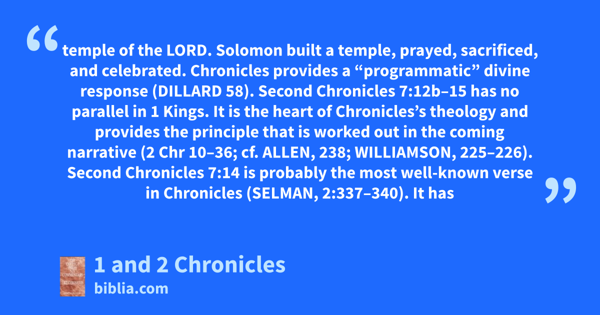 temple of the LORD. Solomon built a temple, prayed, sacrificed, and celebrated. Chronicles provides a “programmatic” divine response (DILLARD 58). Second Chronicles 7:12b–15 has no parallel in 1 Kings. It is the heart of Chronicles’s theology and provides the principle that is worked out in the coming narrative (2 Chr 10–36; cf. ALLEN, 238; WILLIAMSON, 225–226). Second Chronicles 7:14 is probably the most well-known verse in Chronicles (SELMAN, 2:337–340). It has