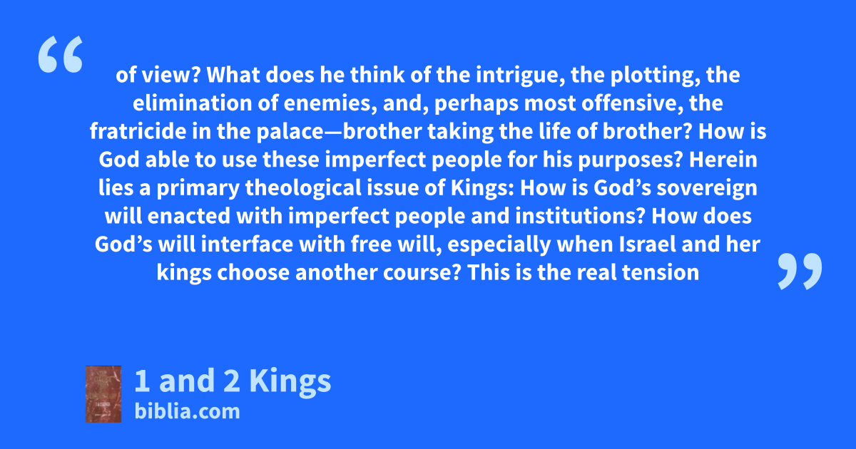 of view? What does he think of the intrigue, the plotting, the elimination of enemies, and, perhaps most offensive, the fratricide in the palace—brother taking the life of brother? How is God able to use these imperfect people for his purposes? Herein lies a primary theological issue of Kings: How is God’s sovereign will enacted with imperfect people and institutions? How does God’s will interface with free will, especially when Israel and her kings choose another course? This is the real tension