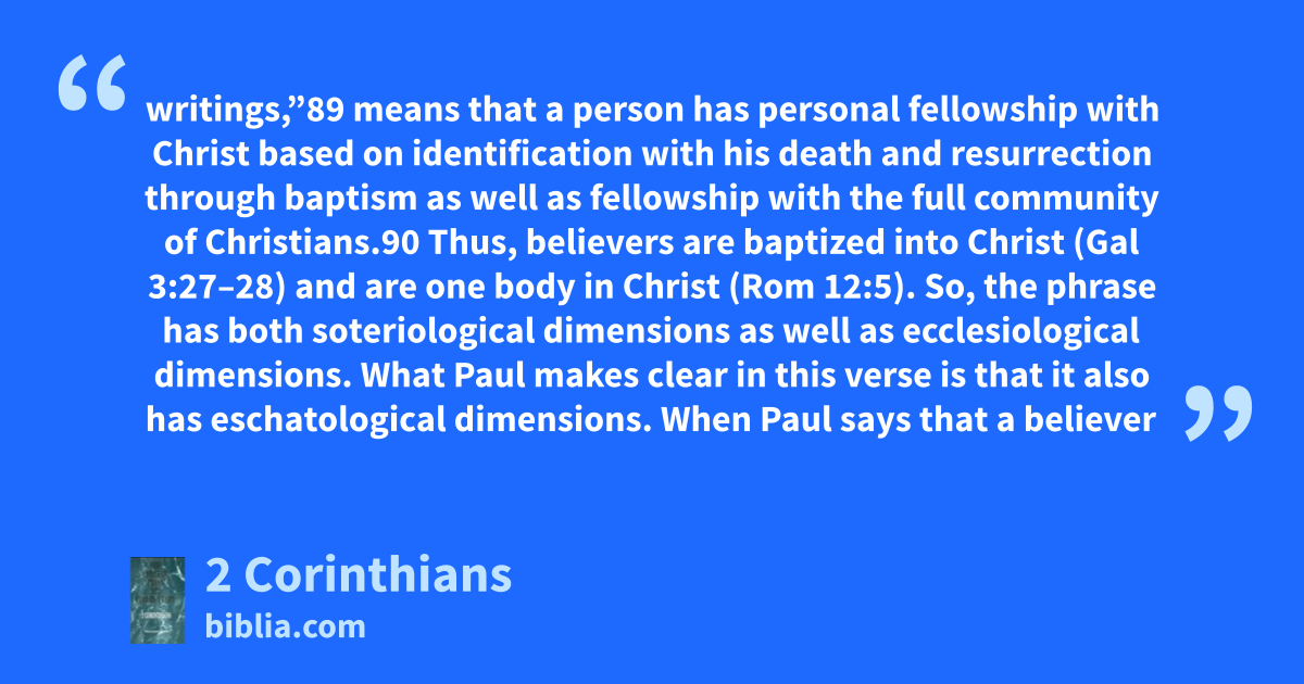 writings,”89 means that a person has personal fellowship with Christ based on identification with his death and resurrection through baptism as well as fellowship with the full community of Christians.90 Thus, believers are baptized into Christ (Gal 3:27–28) and are one body in Christ (Rom 12:5). So, the phrase has both soteriological dimensions as well as ecclesiological dimensions. What Paul makes clear in this verse is that it also has eschatological dimensions. When Paul says that a believer