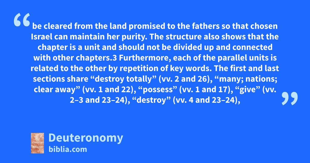be cleared from the land promised to the fathers so that chosen Israel can maintain her purity. The structure also shows that the chapter is a unit and should not be divided up and connected with other chapters.3 Furthermore, each of the parallel units is related to the other by repetition of key words. The first and last sections share “destroy totally” (vv. 2 and 26), “many; nations; clear away” (vv. 1 and 22), “possess” (vv. 1 and 17), “give” (vv. 2–3 and 23–24), “destroy” (vv. 4 and 23–24),