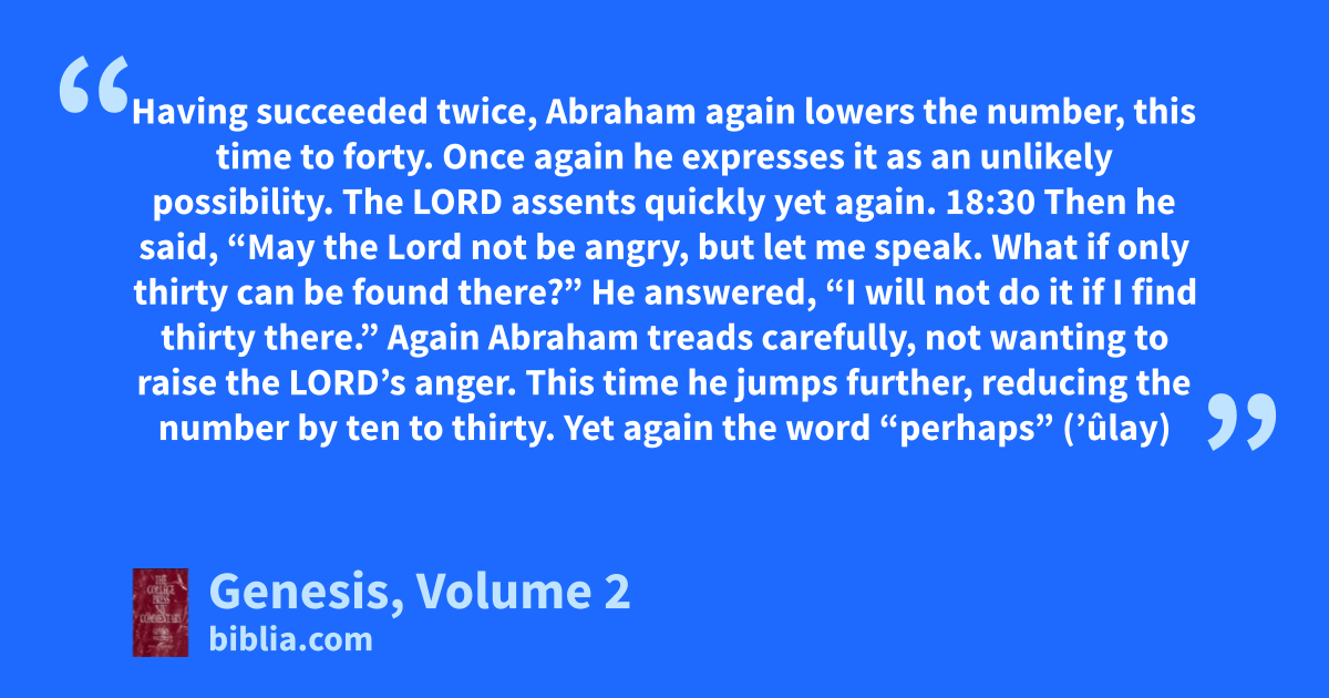 Having succeeded twice, Abraham again lowers the number, this time to forty. Once again he expresses it as an unlikely possibility. The LORD assents quickly yet again. 18:30 Then he said, “May the Lord not be angry, but let me speak. What if only thirty can be found there?” He answered, “I will not do it if I find thirty there.” Again Abraham treads carefully, not wanting to raise the LORD’s anger. This time he jumps further, reducing the number by ten to thirty. Yet again the word “perhaps” (’ûlay)