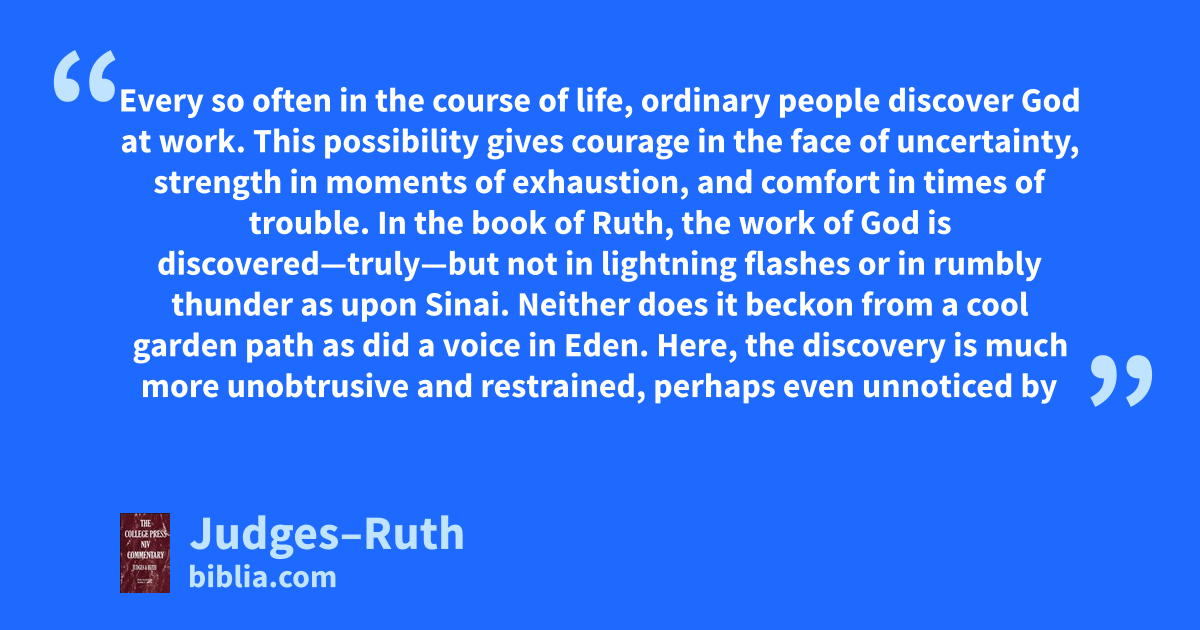 Every so often in the course of life, ordinary people discover God at work. This possibility gives courage in the face of uncertainty, strength in moments of exhaustion, and comfort in times of trouble. In the book of Ruth, the work of God is discovered—truly—but not in lightning flashes or in rumbly thunder as upon Sinai. Neither does it beckon from a cool garden path as did a voice in Eden. Here, the discovery is much more unobtrusive and restrained, perhaps even unnoticed by