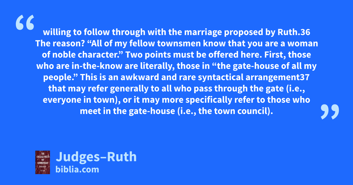 willing to follow through with the marriage proposed by Ruth.36 The reason? “All of my fellow townsmen know that you are a woman of noble character.” Two points must be offered here. First, those who are in-the-know are literally, those in “the gate-house of all my people.” This is an awkward and rare syntactical arrangement37 that may refer generally to all who pass through the gate (i.e., everyone in town), or it may more specifically refer to those who meet in the gate-house (i.e., the town council).