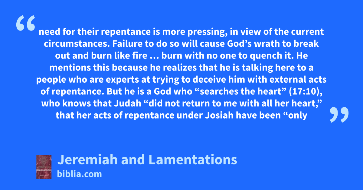 need for their repentance is more pressing, in view of the current circumstances. Failure to do so will cause God’s wrath to break out and burn like fire … burn with no one to quench it. He mentions this because he realizes that he is talking here to a people who are experts at trying to deceive him with external acts of repentance. But he is a God who “searches the heart” (17:10), who knows that Judah “did not return to me with all her heart,” that her acts of repentance under Josiah have been “only