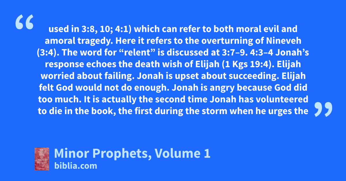 used in 3:8, 10; 4:1) which can refer to both moral evil and amoral tragedy. Here it refers to the overturning of Nineveh (3:4). The word for “relent” is discussed at 3:7–9. 4:3–4 Jonah’s response echoes the death wish of Elijah (1 Kgs 19:4). Elijah worried about failing. Jonah is upset about succeeding. Elijah felt God would not do enough. Jonah is angry because God did too much. It is actually the second time Jonah has volunteered to die in the book, the first during the storm when he urges the
