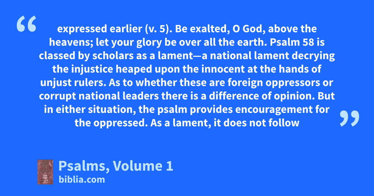 expressed earlier (v. 5). Be exalted, O God, above the heavens; let your glory be over all the earth. Psalm 58 is classed by scholars as a lament—a national lament decrying the injustice heaped upon the innocent at the hands of unjust rulers. As to whether these are foreign oppressors or corrupt national leaders there is a difference of opinion. But in either situation, the psalm provides encouragement for the oppressed. As a lament, it does not follow