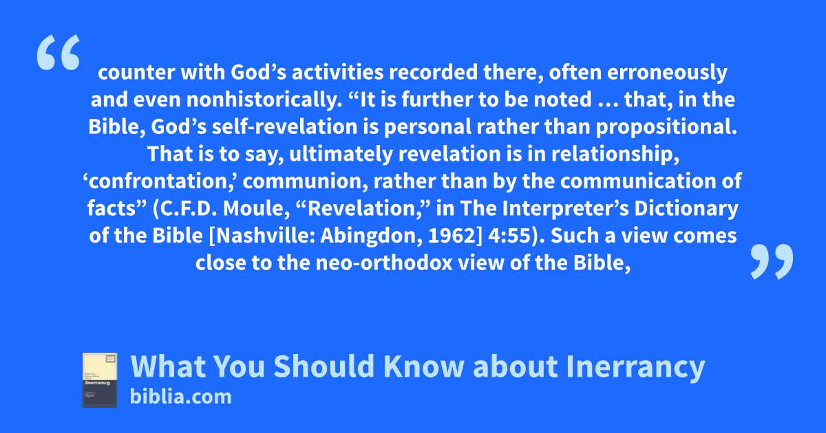 counter with God’s activities recorded there, often erroneously and even nonhistorically. “It is further to be noted … that, in the Bible, God’s self-revelation is personal rather than propositional. That is to say, ultimately revelation is in relationship, ‘confrontation,’ communion, rather than by the communication of facts” (C.F.D. Moule, “Revelation,” in The Interpreter’s Dictionary of the Bible [Nashville: Abingdon, 1962] 4:55). Such a view comes close to the neo-orthodox view of the Bible,