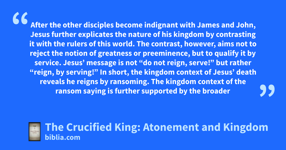 After the other disciples become indignant with James and John, Jesus further explicates the nature of his kingdom by contrasting it with the rulers of this world. The contrast, however, aims not to reject the notion of greatness or preeminence, but to qualify it by service. Jesus’ message is not “do not reign, serve!” but rather “reign, by serving!” In short, the kingdom context of Jesus’ death reveals he reigns by ransoming. The kingdom context of the ransom saying is further supported by the broader