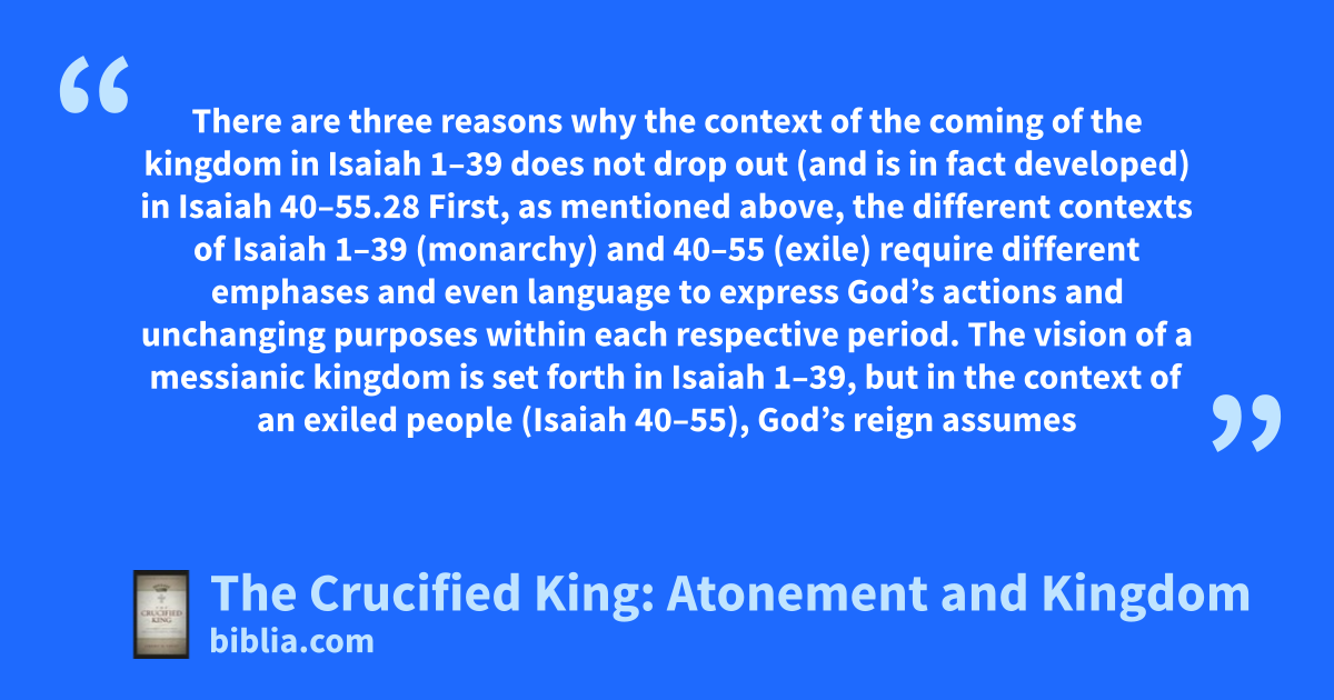 There are three reasons why the context of the coming of the kingdom in Isaiah 1–39 does not drop out (and is in fact developed) in Isaiah 40–55.28 First, as mentioned above, the different contexts of Isaiah 1–39 (monarchy) and 40–55 (exile) require different emphases and even language to express God’s actions and unchanging purposes within each respective period. The vision of a messianic kingdom is set forth in Isaiah 1–39, but in the context of an exiled people (Isaiah 40–55), God’s reign assumes
