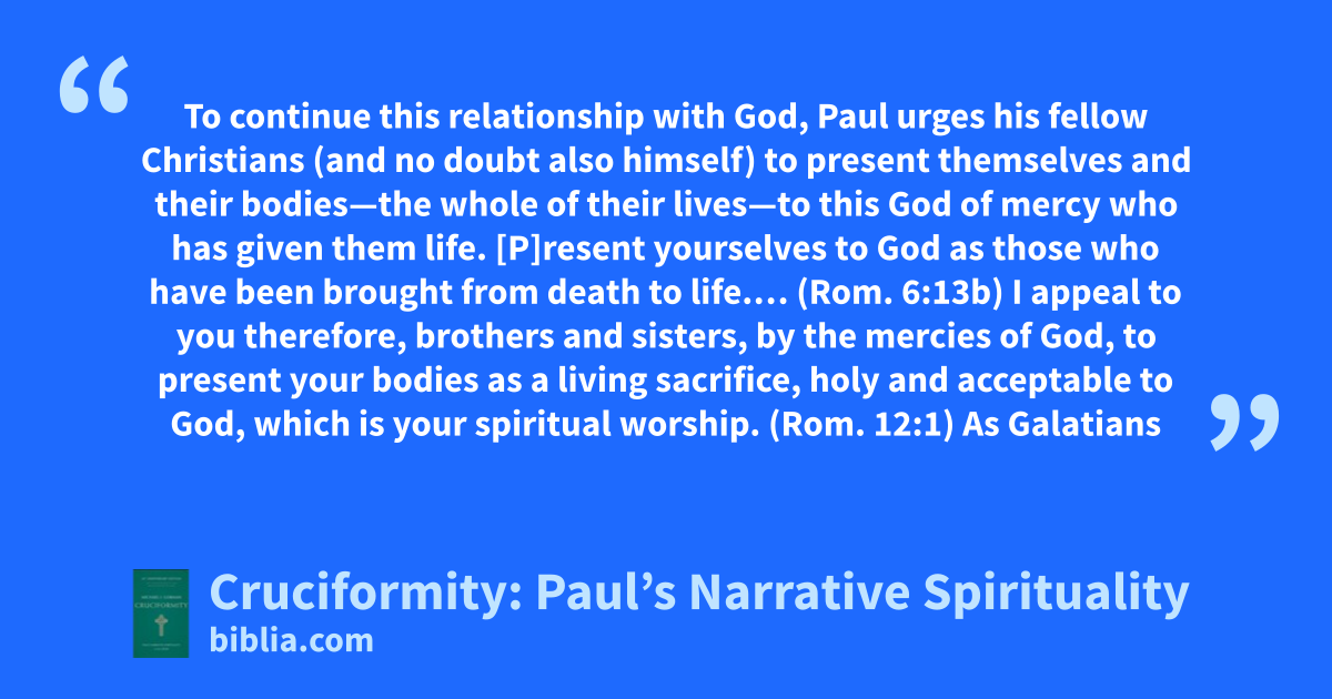 To continue this relationship with God, Paul urges his fellow Christians (and no doubt also himself) to present themselves and their bodies—the whole of their lives—to this God of mercy who has given them life. [P]resent yourselves to God as those who have been brought from death to life.… (Rom. 6:13b) I appeal to you therefore, brothers and sisters, by the mercies of God, to present your bodies as a living sacrifice, holy and acceptable to God, which is your spiritual worship. (Rom. 12:1) As Galatians
