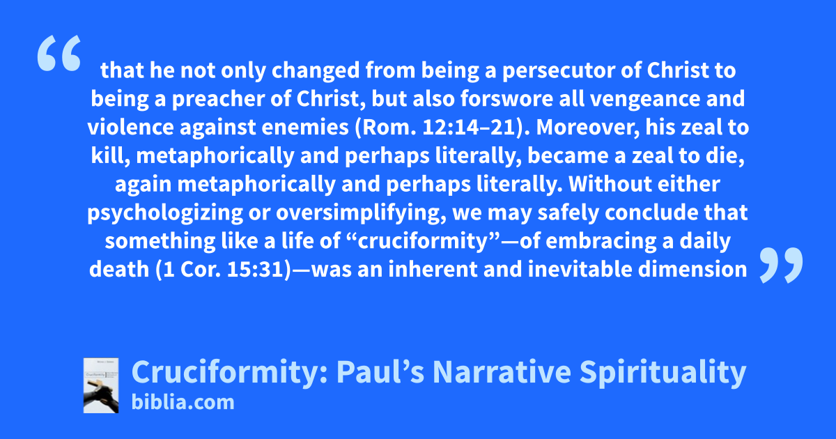 that he not only changed from being a persecutor of Christ to being a preacher of Christ, but also forswore all vengeance and violence against enemies (Rom. 12:14–21). Moreover, his zeal to kill, metaphorically and perhaps literally, became a zeal to die, again metaphorically and perhaps literally. Without either psychologizing or oversimplifying, we may safely conclude that something like a life of “cruciformity”—of embracing a daily death (1 Cor. 15:31)—was an inherent and inevitable dimension
