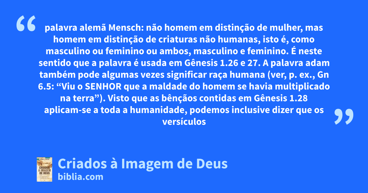 palavra alemã Mensch: não homem em distinção de mulher, mas homem em distinção de criaturas não humanas, isto é, como masculino ou feminino ou ambos, masculino e feminino. É neste sentido que a palavra é usada em Gênesis 1.26 e 27. A palavra adam também pode algumas vezes significar raça humana (ver, p. ex., Gn 6.5: “Viu o SENHOR que a maldade do homem se havia multiplicado na terra”). Visto que as bênçãos contidas em Gênesis 1.28 aplicam-se a toda a humanidade, podemos inclusive dizer que os versículos
