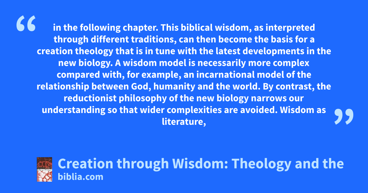 in the following chapter. This biblical wisdom, as interpreted through different traditions, can then become the basis for a creation theology that is in tune with the latest developments in the new biology. A wisdom model is necessarily more complex compared with, for example, an incarnational model of the relationship between God, humanity and the world. By contrast, the reductionist philosophy of the new biology narrows our understanding so that wider complexities are avoided. Wisdom as literature,