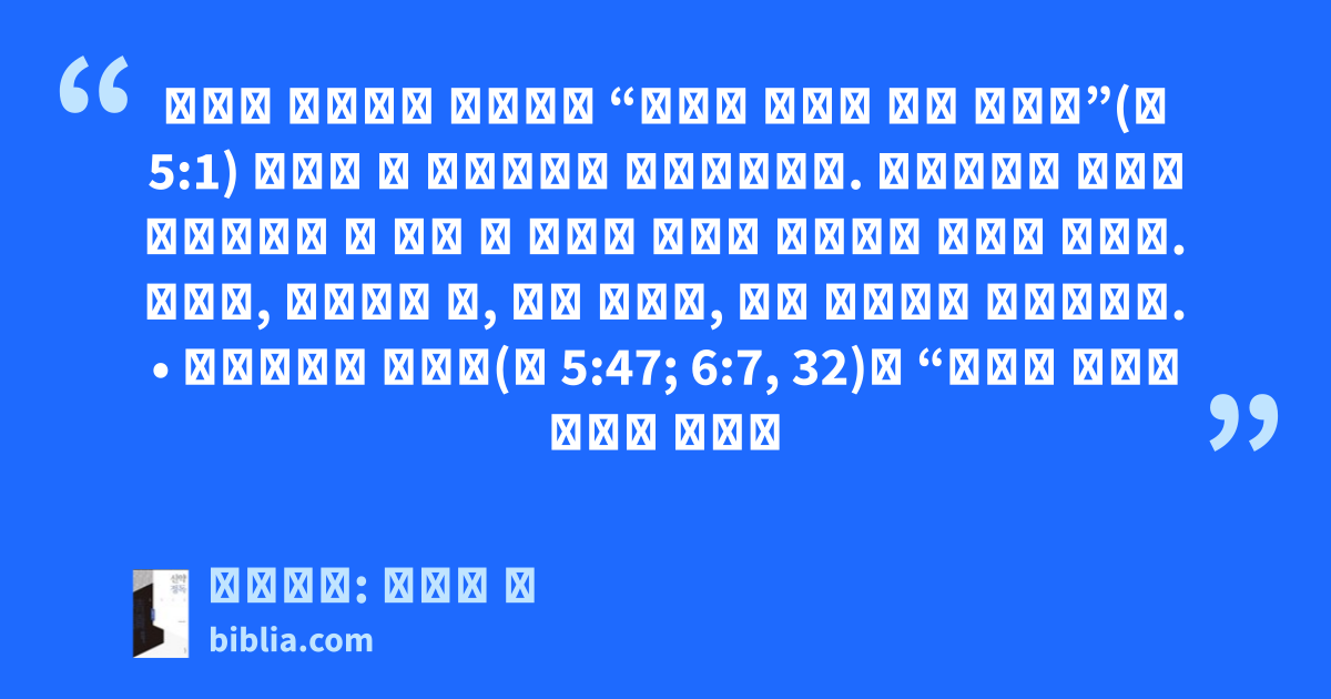 사역을 시작하신 예수님은 “무리를 보시고 산에 올라가”(마 5:1) 앉으신 후 산상수훈을 가르치십니다. 산상수훈을 제대로 이해하려면 그 속에 네 종류의 사람이 등장함을 알아야 합니다. 이방인, 외식하는 자, 율법 폐기자, 하늘 아버지의 자녀입니다. • 산상수훈의 이방인(마 5:47; 6:7, 32)은 “무엇을 먹을까 무엇을 마실까