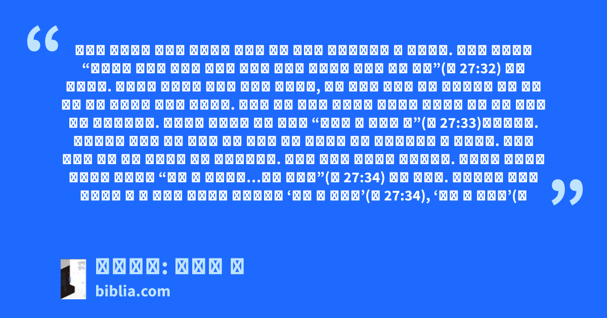 하지만 예수님은 무거운 십자가를 감당치 못해 자꾸만 떨어뜨리셨던 것 같습니다. 그래서 군병들은 “시몬이란 구레네 사람을 만나매 그에게 예수의 십자가를 억지로 지워 가게”(마 27:32) 했던 것입니다. 구레네는 아프리카 리비아 키레네 지역으로, 당시 시몬은 아마도 괜히 예루살렘에 와서 재수 없는 일을 당했다고 느꼈을 것입니다. 하지만 실은 인류를 구원하신 예수님의 십자가를 함께 지는 영예를 얻은 것이었습니다. 예수님이 십자가를 지신 장소는 “골고다 즉 해골의 곳”(마 27:33)이었습니다. 무시무시한 이름이 붙은 것으로 보아 그곳은 당시 공식적인 사형 집행장이었던 것 같습니다. 영적인 의미로 보면 모든 인생들의 최종 목적지입니다. 죽음과 멸망의 장소이기 때문입니다. 군병들은 골고다에 도착하자 예수님께 “쓸개 탄 포도주를…주어 마시게”(마 27:34) 하려 합니다. 사복음서의 십자가 사건에는 총 세 종류의 포도주가 언급되는데 ‘쓸개 탄 포도주’(마 27:34), ‘몰약 탄 포도주’(막