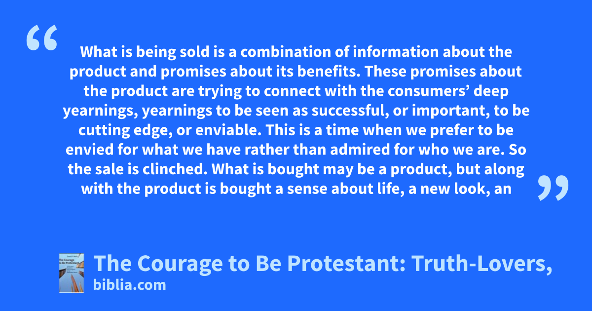 What is being sold is a combination of information about the product and promises about its benefits. These promises about the product are trying to connect with the consumers’ deep yearnings, yearnings to be seen as successful, or important, to be cutting edge, or enviable. This is a time when we prefer to be envied for what we have rather than admired for who we are. So the sale is clinched. What is bought may be a product, but along with the product is bought a sense about life, a new look, an
