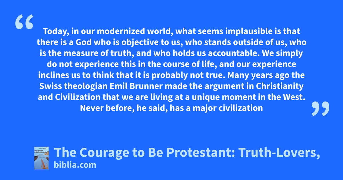 Today, in our modernized world, what seems implausible is that there is a God who is objective to us, who stands outside of us, who is the measure of truth, and who holds us accountable. We simply do not experience this in the course of life, and our experience inclines us to think that it is probably not true. Many years ago the Swiss theologian Emil Brunner made the argument in Christianity and Civilization that we are living at a unique moment in the West. Never before, he said, has a major civilization