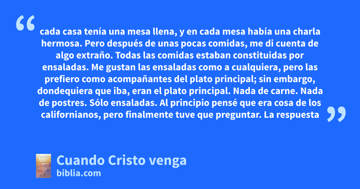 cada casa tenía una mesa llena, y en cada mesa había una charla hermosa. Pero después de unas pocas comidas, me di cuenta de algo extraño. Todas las comidas estaban constituidas por ensaladas. Me gustan las ensaladas como a cualquiera, pero las prefiero como acompañantes del plato principal; sin embargo, dondequiera que iba, eran el plato principal. Nada de carne. Nada de postres. Sólo ensaladas. Al principio pensé que era cosa de los californianos, pero finalmente tuve que preguntar. La respuesta