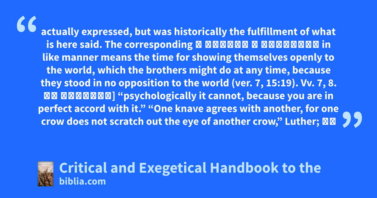 actually expressed, but was historically the fulfillment of what is here said. The corresponding ὁ καιρὸς ὁ ὑμέτερος in like manner means the time for showing themselves openly to the world, which the brothers might do at any time, because they stood in no opposition to the world (ver. 7, 15:19). Vv. 7, 8. οὐ δύναται] “psychologically it cannot, because you are in perfect accord with it.” “One knave agrees with another, for one crow does not scratch out the eye of another crow,” Luther; τὸ