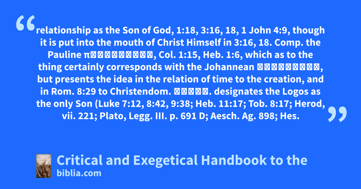relationship as the Son of God, 1:18, 3:16, 18, 1 John 4:9, though it is put into the mouth of Christ Himself in 3:16, 18. Comp. the Pauline πρωτοτόκος, Col. 1:15, Heb. 1:6, which as to the thing certainly corresponds with the Johannean μονογενής, but presents the idea in the relation of time to the creation, and in Rom. 8:29 to Christendom. Μονογ. designates the Logos as the only Son (Luke 7:12, 8:42, 9:38; Heb. 11:17; Tob. 8:17; Herod, vii. 221; Plato, Legg. III. p. 691 D; Aesch. Ag. 898; Hes.