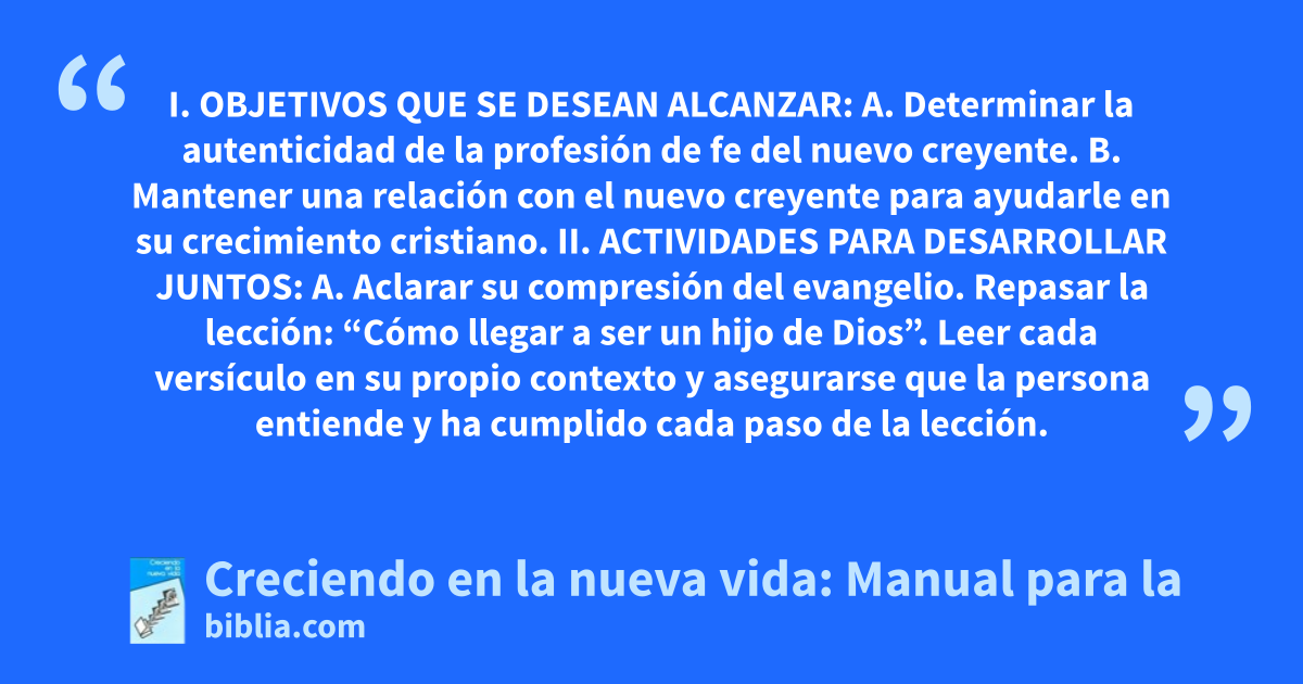 I. OBJETIVOS QUE SE DESEAN ALCANZAR: A. Determinar la autenticidad de la profesión de fe del nuevo creyente. B. Mantener una relación con el nuevo creyente para ayudarle en su crecimiento cristiano. II. ACTIVIDADES PARA DESARROLLAR JUNTOS: A. Aclarar su compresión del evangelio. Repasar la lección: “Cómo llegar a ser un hijo de Dios”. Leer cada versículo en su propio contexto y asegurarse que la persona entiende y ha cumplido cada paso de la lección.