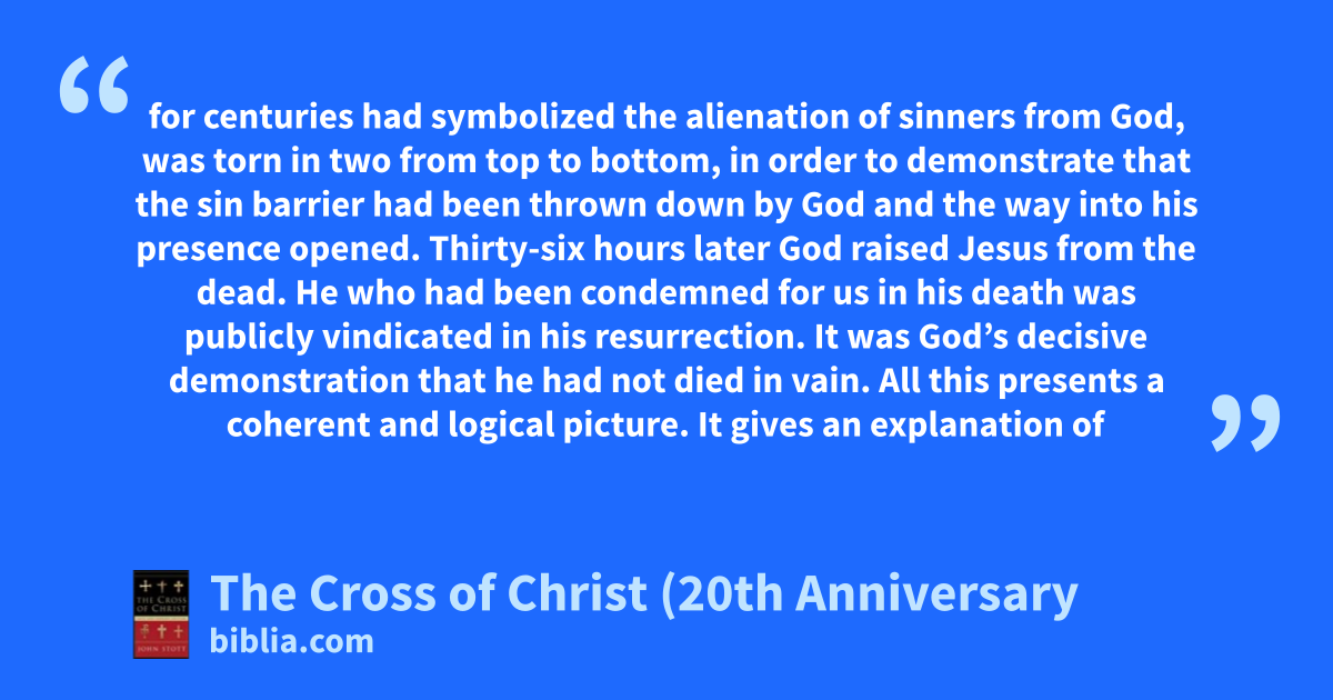 for centuries had symbolized the alienation of sinners from God, was torn in two from top to bottom, in order to demonstrate that the sin barrier had been thrown down by God and the way into his presence opened. Thirty-six hours later God raised Jesus from the dead. He who had been condemned for us in his death was publicly vindicated in his resurrection. It was God’s decisive demonstration that he had not died in vain. All this presents a coherent and logical picture. It gives an explanation of