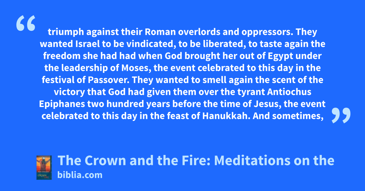 triumph against their Roman overlords and oppressors. They wanted Israel to be vindicated, to be liberated, to taste again the freedom she had had when God brought her out of Egypt under the leadership of Moses, the event celebrated to this day in the festival of Passover. They wanted to smell again the scent of the victory that God had given them over the tyrant Antiochus Epiphanes two hundred years before the time of Jesus, the event celebrated to this day in the feast of Hanukkah. And sometimes,